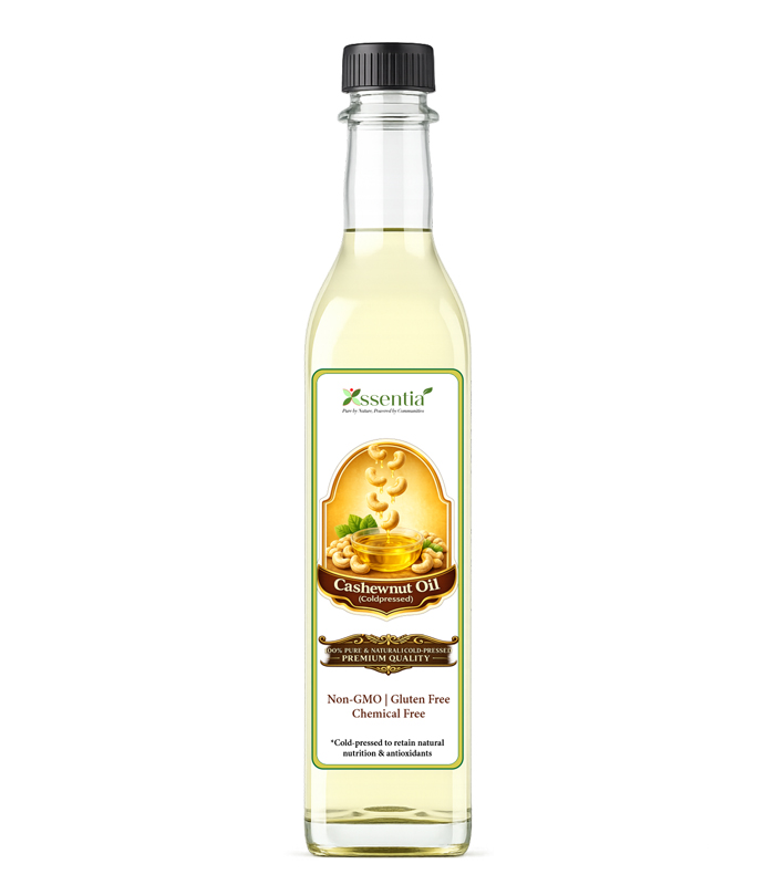 Xssentia Virgin Cold-Pressed Cashewnut Oil is carefully extracted from high-quality cashew nuts using a traditional cold-pressing method.Grown in the farms of Kokan belt in a natural form as possible.Made from carefully selected cashewnuts sourced from the Konkan belt of Maharashtra&Goa. Pressed at controlled low temperatures, the oil undergoes minimal processing, helping retain its natural fatty acid profile, smooth texture, and mild nutty taste.